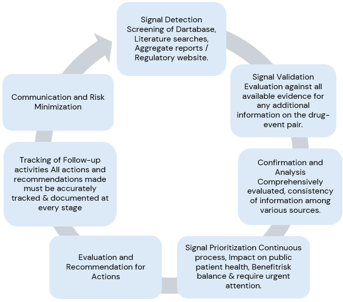 Signal detection, Signal validation, Signal analysis and prioritization, Signal assessment, and Recommendations for action.